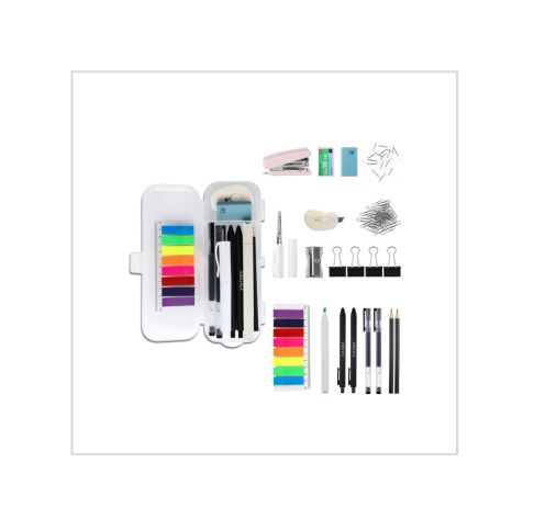 - 【EASY TO CARRY】- Our office supplies are packed in a reusable transparent plastic organizer case with 6 separated compartments, easy to carry and store when traveling or Outing. This small office supplies supply you with a matching set of everything you need for your work space.