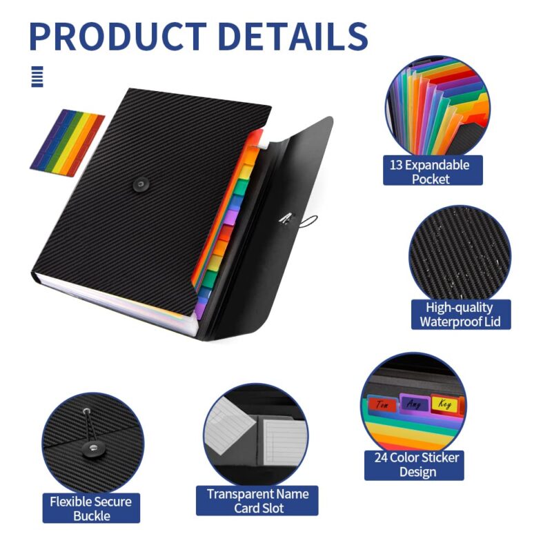 - 【RAINBOW COLORED DESIGN】Nicecho 13 Pockets File Folder is updated with nice colored inner pages for better visual sense. small colored labels can give your files a convenient classification, so that you can quickly find the paper you need.