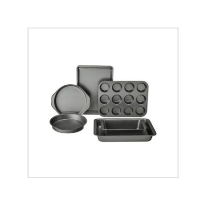 - 6-piece bakeware set includes a 9x5-inch loaf pan, 2 round 9-inch cake pans, a 12-cup muffin pan, a 13x9-inch roast pan, and a 13x9-inch baking sheet