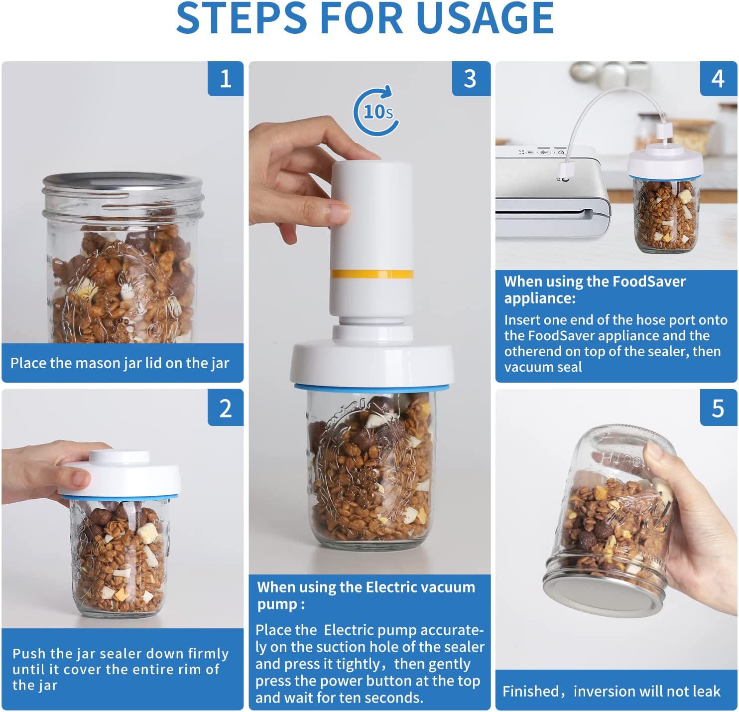 Our vacuum sealer for mason jars is made of premium plastic, which is BPA-free, without any chemicals, food-safe, durable to use, and dishwasher safe.
