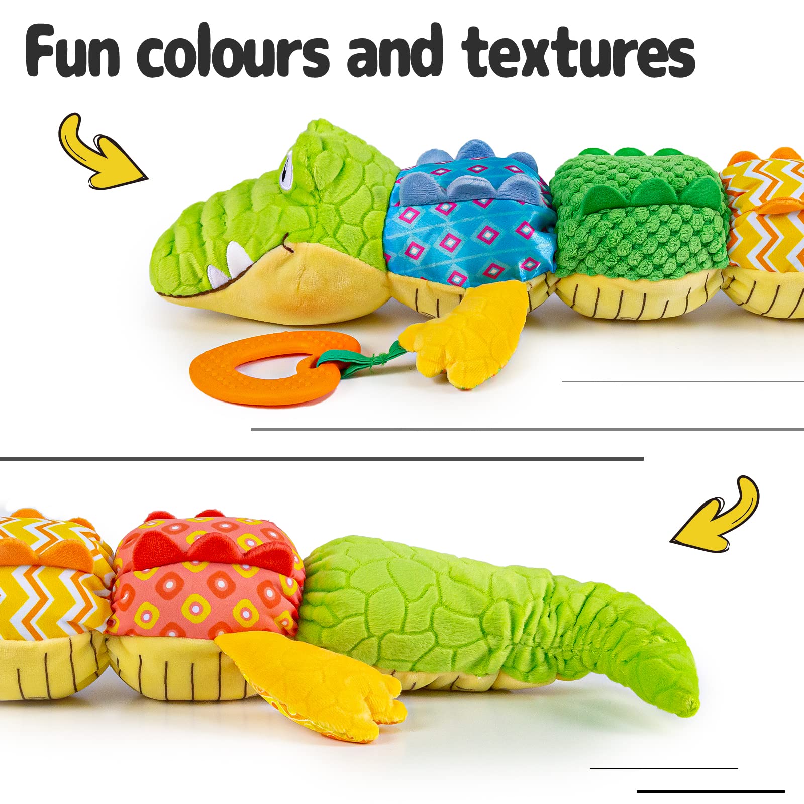 • AUDITORY DEVELOPMENT – The cute musical crocodile can make 4 different sounds: 1x music box (with one song) in the head; 1x BB squeaks, 2x crinkle sound paper on the back; 1 x rattles in the tail. The baby can explore the joy of various sounds from it.